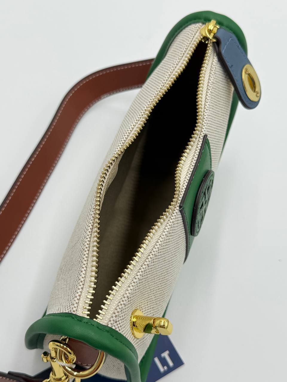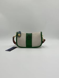 Стильная сумка-багет в комбинированном исполнении: натуральный канвас и сочные зеленые акценты. Этот аксессуар создан, чтобы привлекать взгляды и добавлять уверенности каждому твоему шагу.